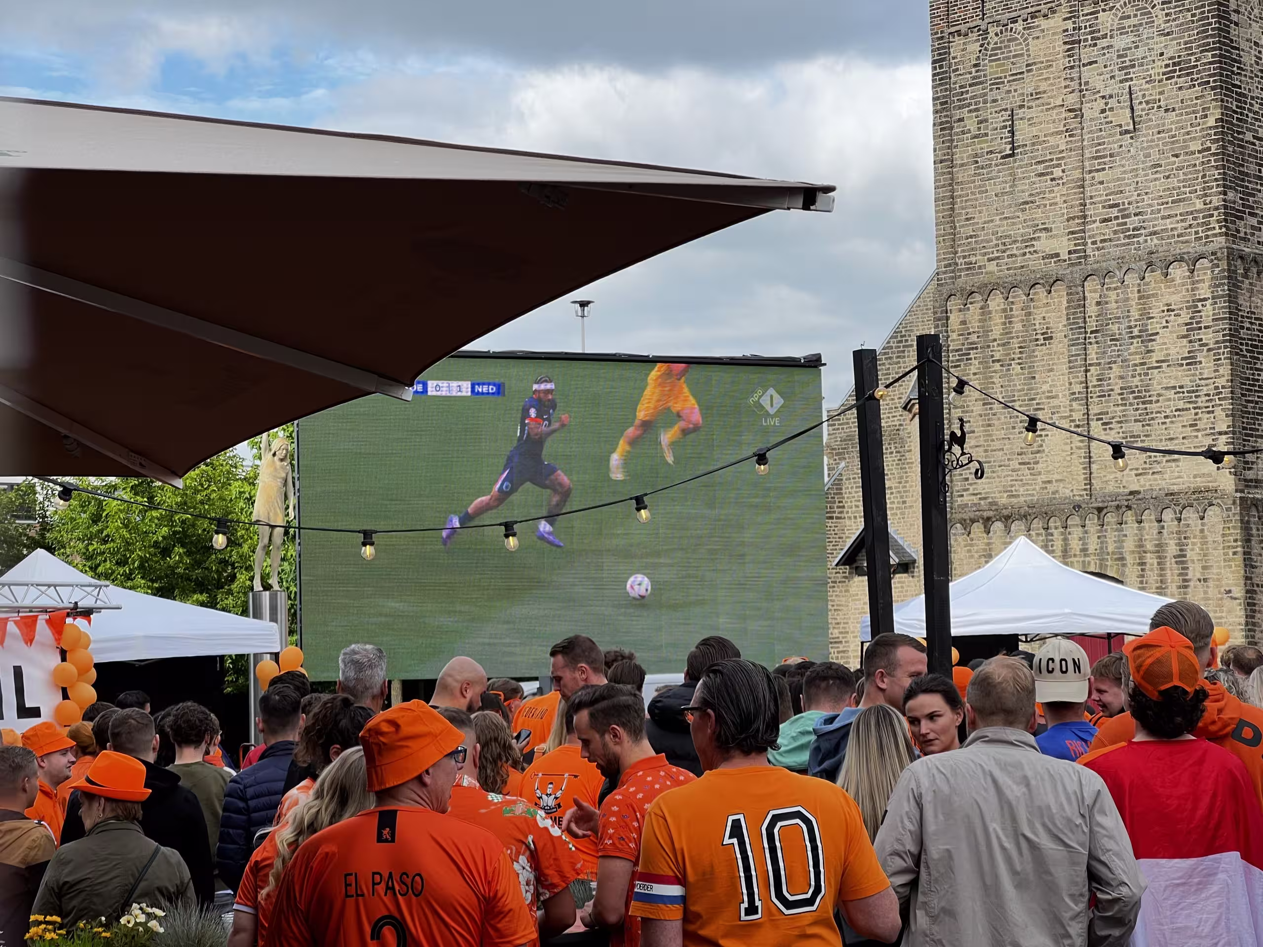 Op het plein richten alle blikken zich op het scherm, terwijl je WK-dorp geniet van de saamhorigheid.